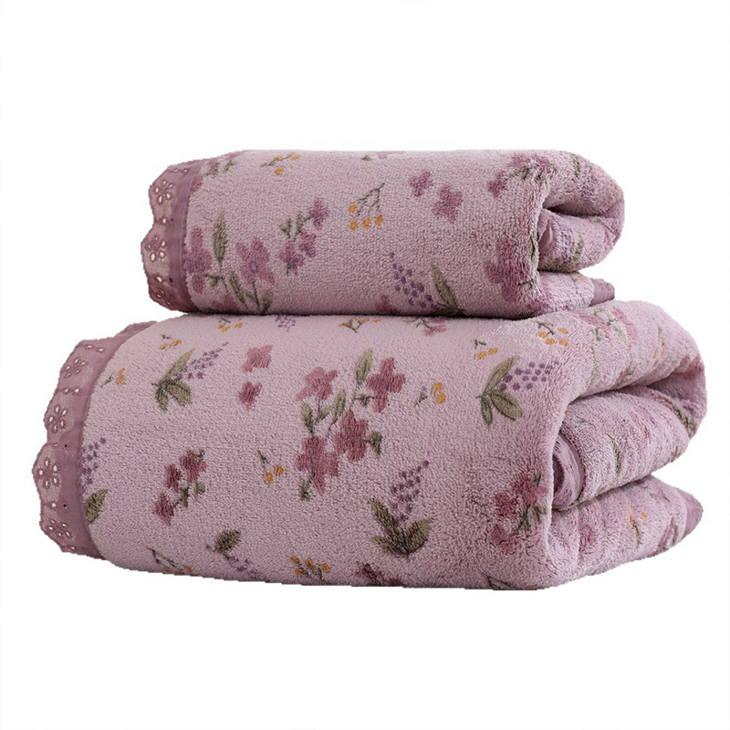 Set of Two Coral Fleece Bath Towels with a Fresh Floral Design, Featuring a Thick, Highly Absorbent Fabric Suitable for Swimming And Bathing, Soft to The Touch, And Quick-Drying with Lace Detailing